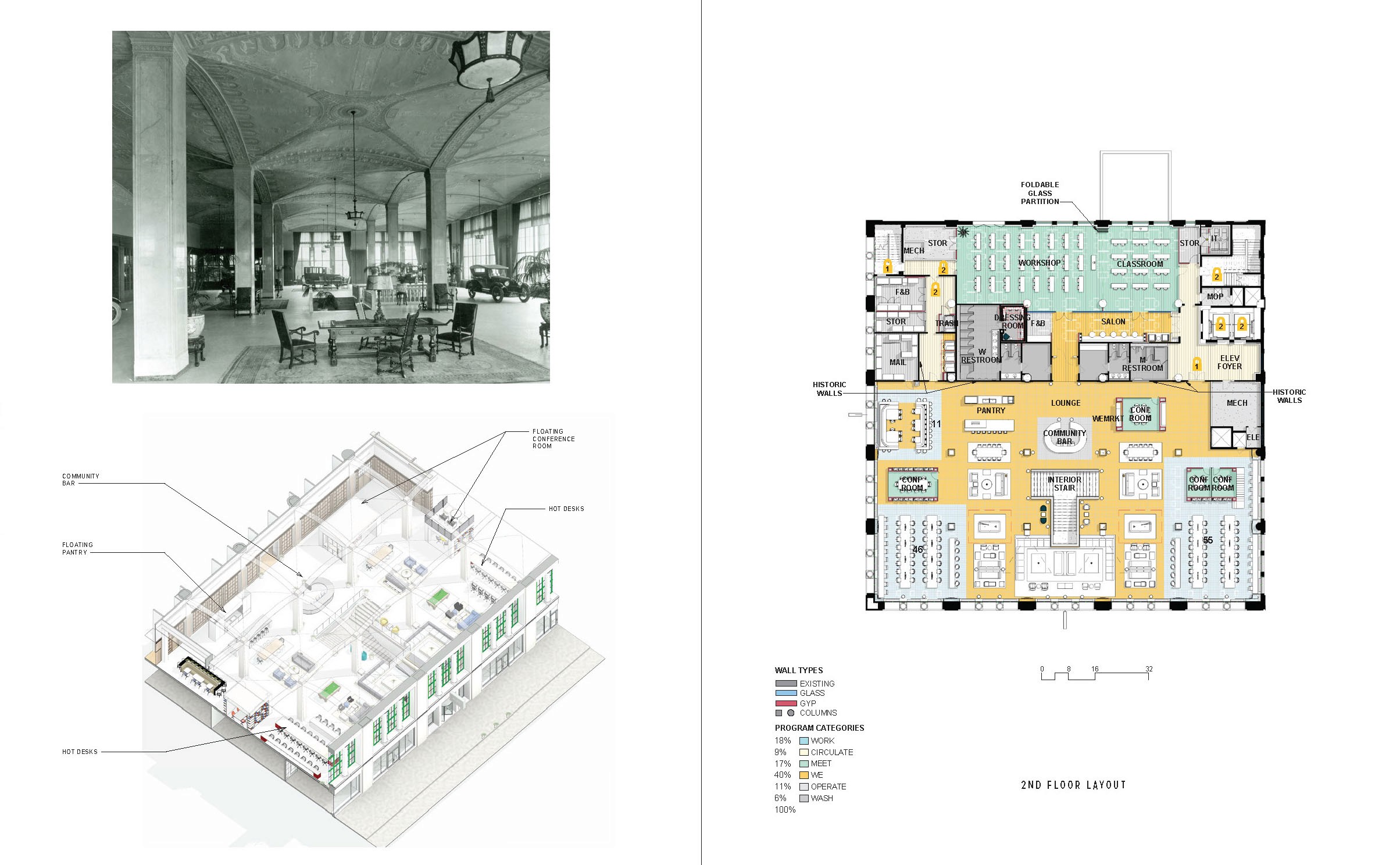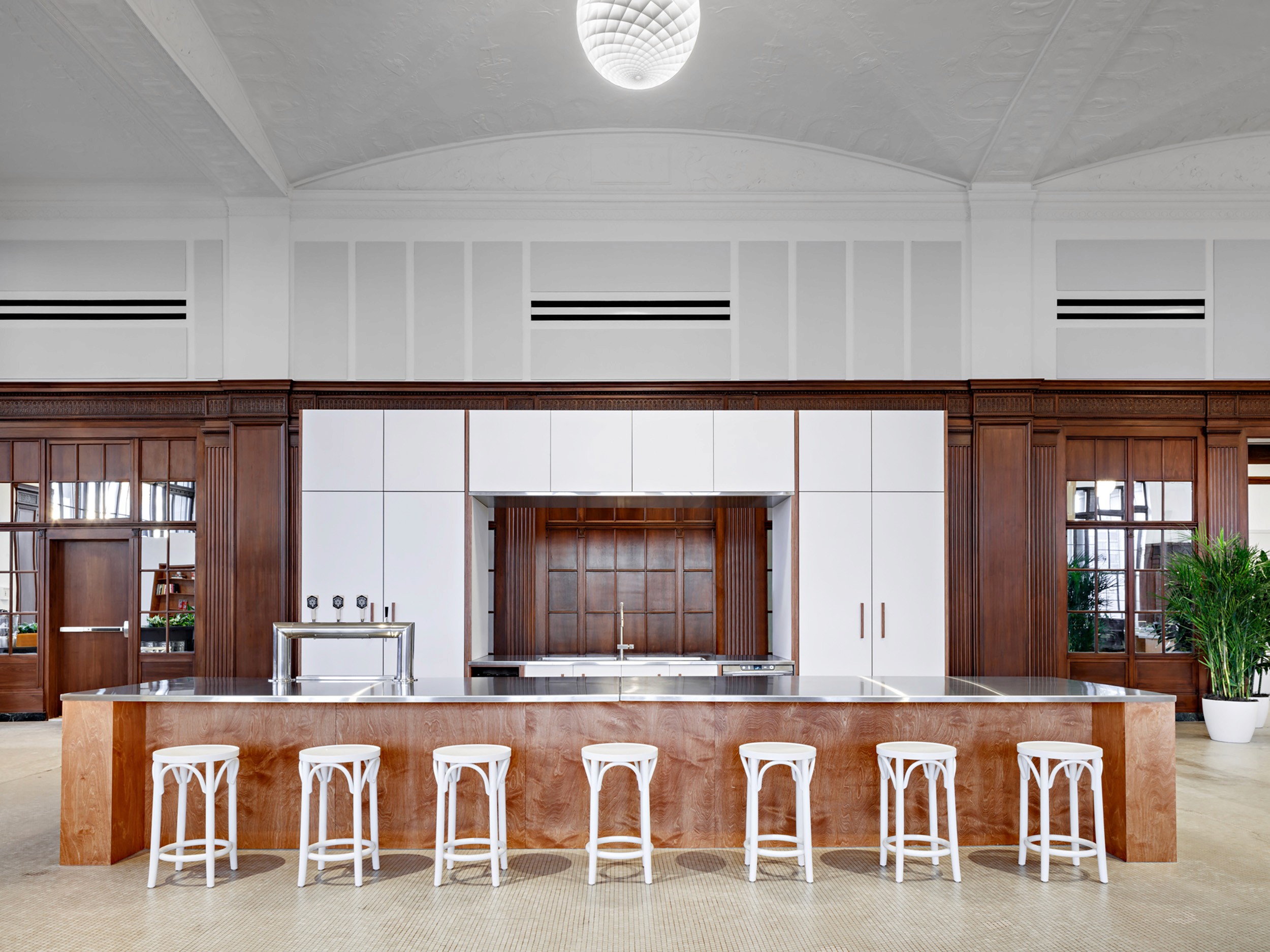 The design aims to preserve, not compete with the original building. walls surrounding the main lounge were restored but remain unaltered and elements hung from the ceiling were minimized, celebrating the existing architecture.