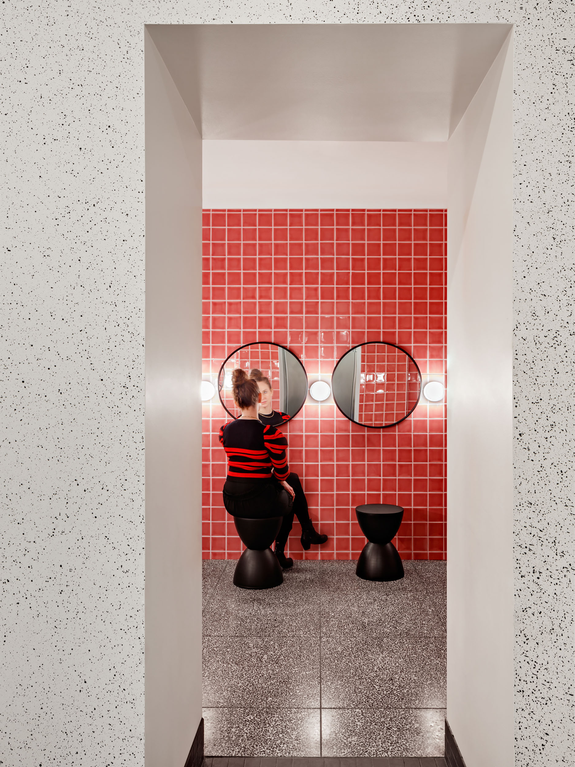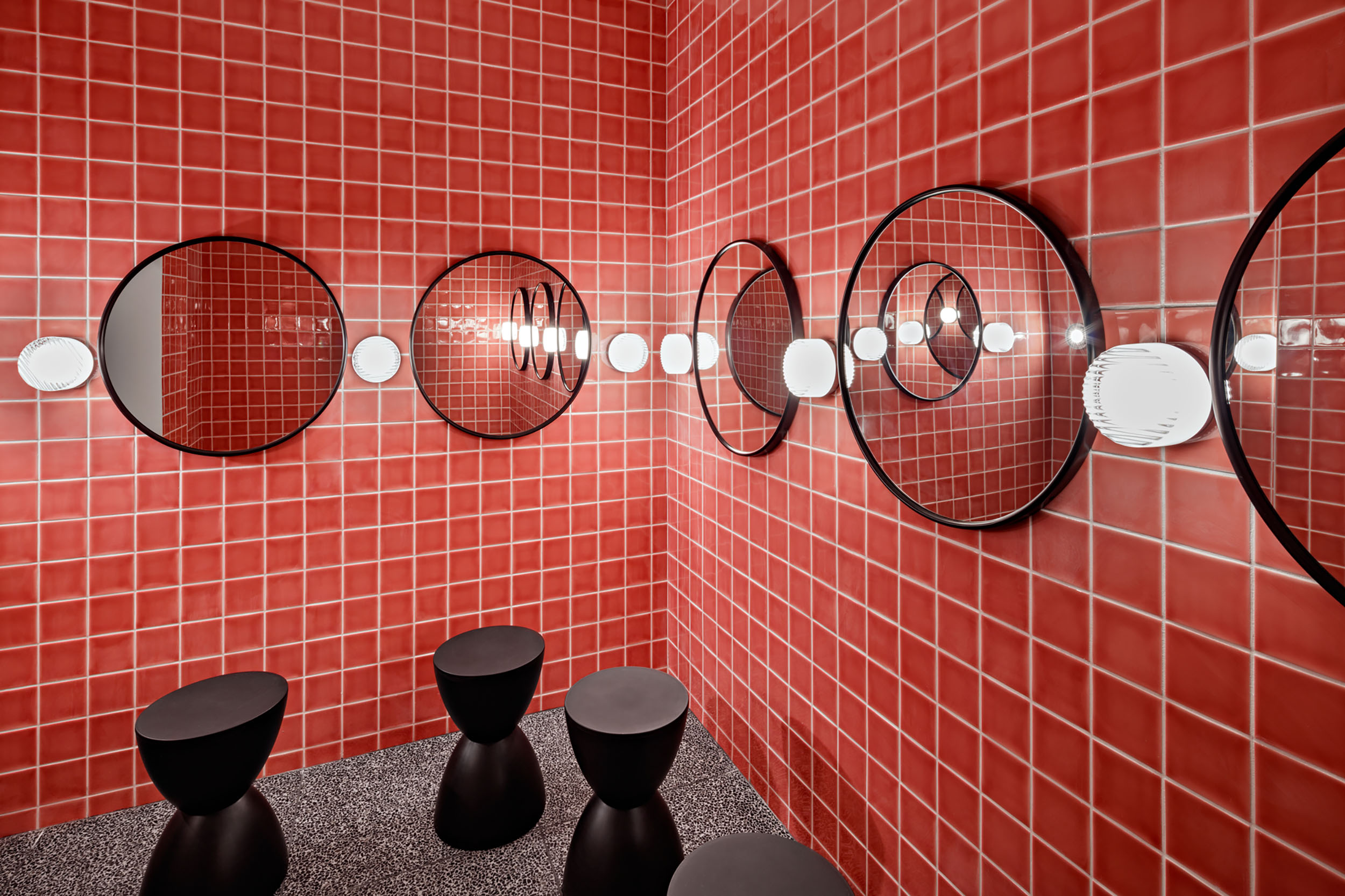 A pink-colored tile was chosen for the walls of the room as an intentional contrast to the rest of the building's more subtle material palette, while also highlighting its unique past as a ‘secret’ space & place of discovery.