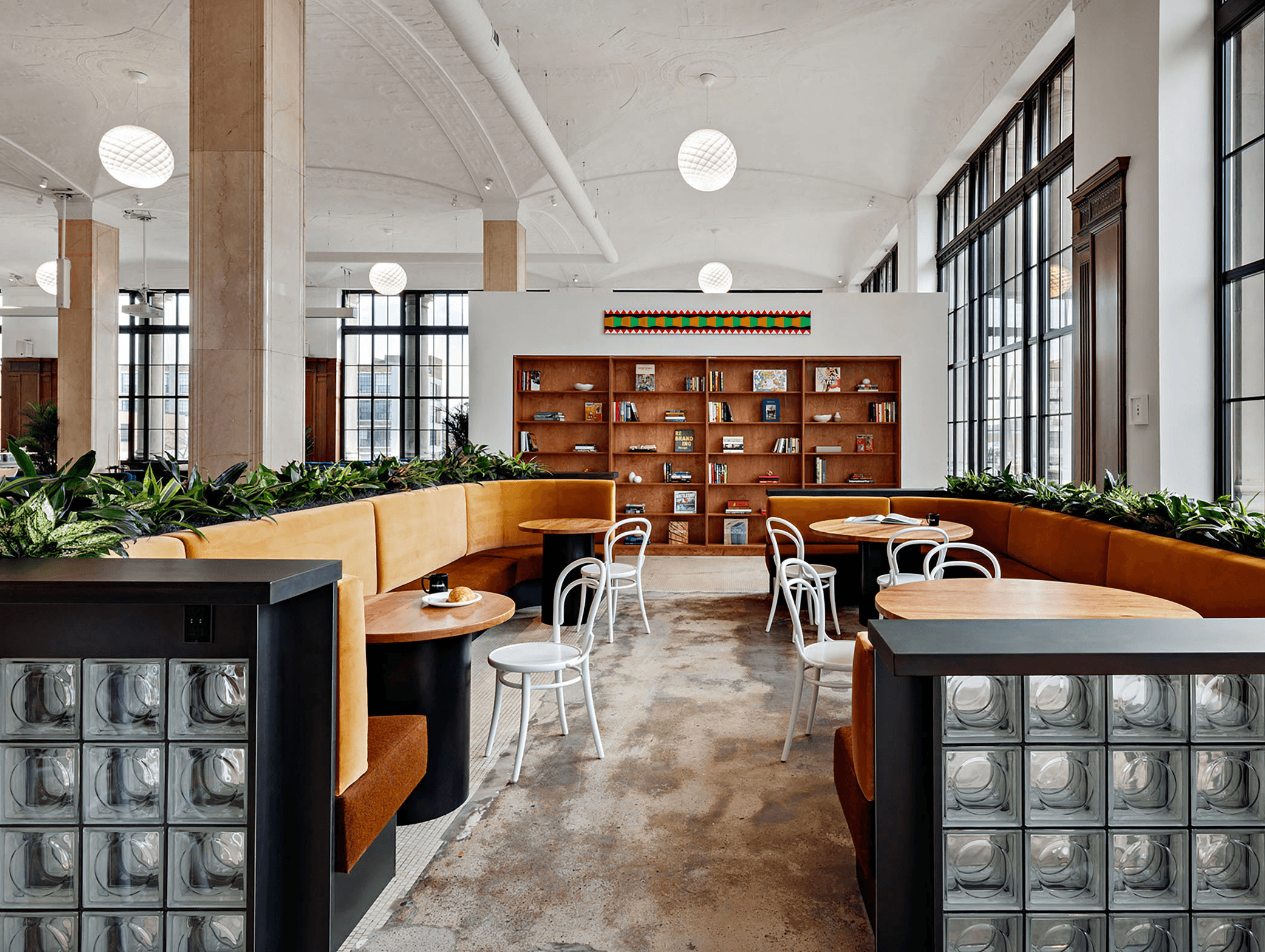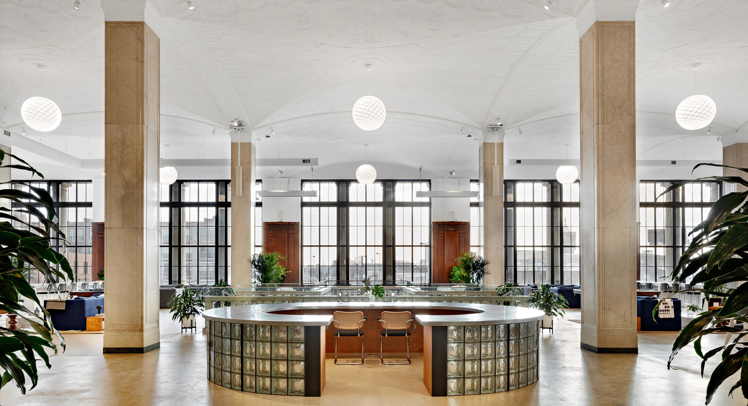 The glass block and blackened metal framing used at the reception desk and banquette seating serve as a nod to Albert Kahn's steel & glass windowed manufacturing plants.